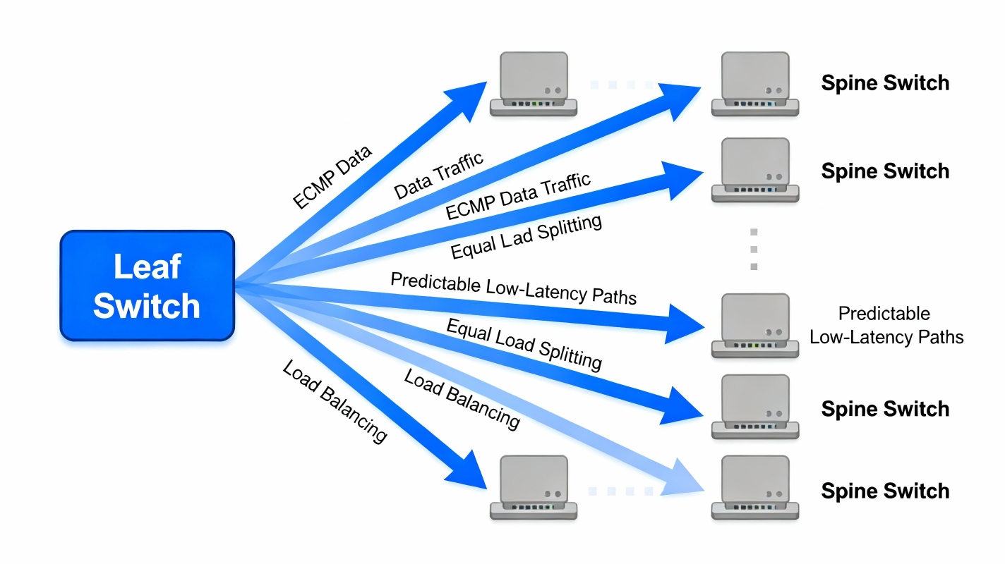Because every leaf connects to all spines, each path has the same cost (distance = 2 hops).