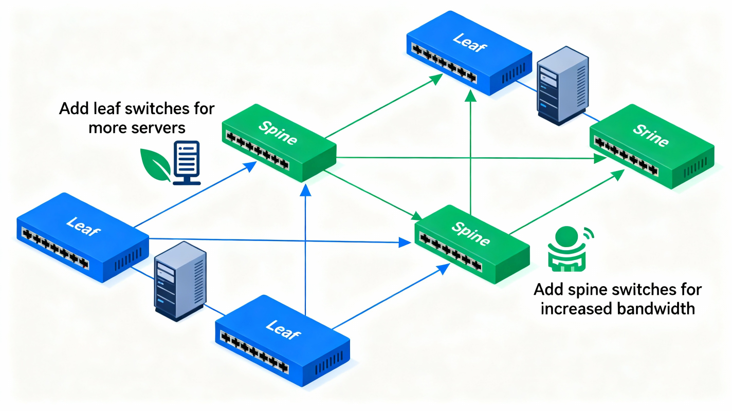 | Upgrade | Complex, disruptive | Add spines/leafs modularly |